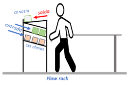 De preferência, coloque o material na frente do operador (abastecimento frontal) ou ao lado (abastecimento lateral). Utilize flow racks para facilitar o abastecimento e a retirada das caixas. Utilize o abastecimento frontal de pequenos contêineres sempre que possível com racks FIFO (primeiro que entra, primeiro que sai).