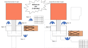 O espaço na linha era limitado, e ela estava cheio de insumos. Eles tinham a prática de levar um palete com insumos referentes a um turno ou até mais. Para evitar que a logística levasse em menor quantidade, realizamos um treinamento sobre logística lean para abastecimento interno. Com isso, conseguimos criar rotas de abastecimento a cada 1 hora, fazendo com que precisássemos de material na linha para apenas 2 horas. Essa ação fez com que os 5S fossem mais fáceis de aplicar, evitando, principalmente, a devolução para o almoxarifado. A produção ganhou 30% de espaço, que era utilizado na linha para insumos.