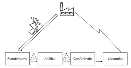 Nesta ilustração, evidencia-se que o processo de análise de produto acabado é iniciado pelo recebimento dos produtos vindos da produção, sendo estes armazenados até disponibilidade de equipamentos e/ou analistas. Em seguida, em grande parte dos laboratórios onde já atuei, há um processo de conferência documental, e somente após isso, realiza-se a liberação do material.