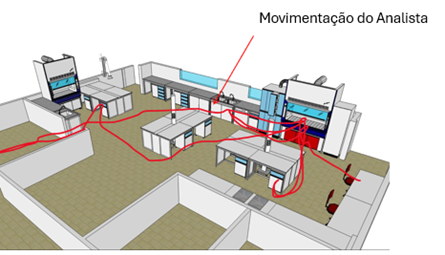 Este desperdício é clássico nos laboratórios e refere-se à quantidade de movimentos necessários para executar determinado método, muitas vezes associado ao layout do laboratório, ou seja, à disposição dos reagentes, vidrarias e consumíveis para atender à rotina do analista. Para identificar esse desperdício, é necessário acompanhar o analista durante sua rotina com um esboço simples da planta do laboratório. Durante esse acompanhamento, simule na planta, com o auxílio de uma caneta, os movimentos que o analista executa para realizar suas atividades.