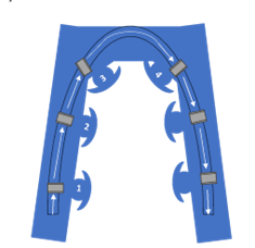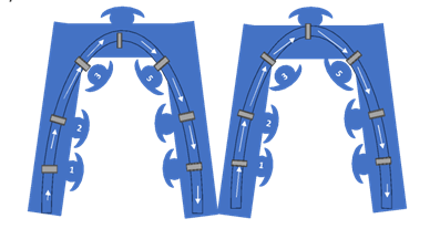 Como o número de operadores ideal é 7, depois de várias análises e conversas com os operadores, chegou-se a um novo leiaute. Além disso, foi um consenso que poderíamos trabalhar com 6 pessoas utilizando o conceito de fluxo contínuo, (faça uma unidade e mova uma unidade), conforme o leiaute e o novo gráfico de balanceamento a seguir: