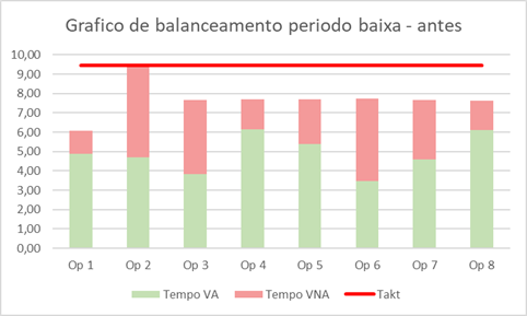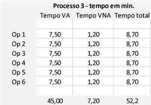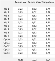 Após a tomada de tempos, foi definido o número de pessoas necessárias para atender ao tempo takt com a configuração atual, usando a seguinte fórmula: número de pessoas = soma (tempos de todos os elementos de trabalho) / tempo takt.