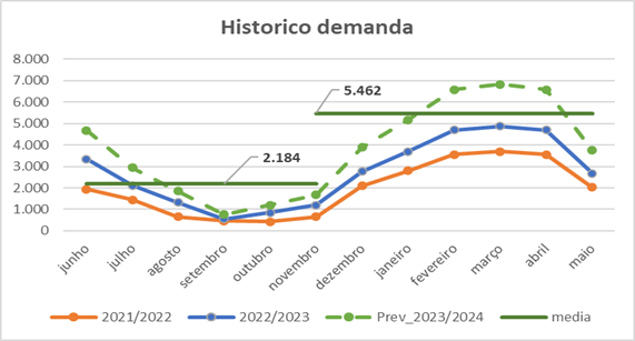 Analisando o gráfico acima, pôde-se constatar que existem dois períodos distintos e cíclicos: o primeiro de junho a novembro, com demanda média prevista para o próximo ciclo de 2184 unidades, e o segundo de dezembro a maio, com demanda média prevista para o próximo ciclo de 5.462 unidades.
