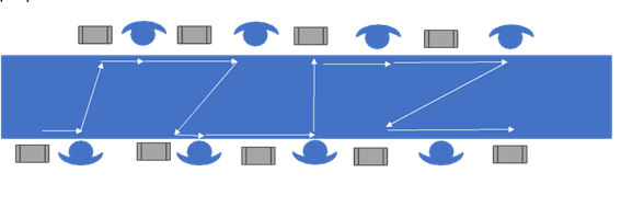 No nosso exemplo, notamos que boa parte dos tempos VNA eram relacionados ao transporte dos operadores em função do leiaute, e também não havia um fluxo contínuo, ou seja, cada operador fazia o seu trabalho e colocava em caixas; somente quando elas estavam cheias é que elas eram levadas para a etapa seguinte pelo próprio operador, conforme o leiaute a seguir: