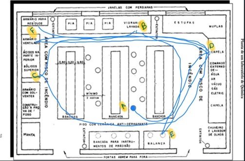Primeira etapa: Você precisará de uma planta baixa do seu laboratório, podendo ser elaborada de forma meramente ilustrativa com auxílio de uma régua (contudo, caso deseje mensurar a distância percorrida na íntegra, faz-se necessário plantas elaboradas com aplicação de medidas precisas, conforme a ilustração abaixo).