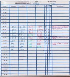 Vejamos um exemplo de gestão visual: o quadro hora a hora na separação, que é um dos primeiros mecanismos que se deve implementar para a aplicação do lean nos CDs, é um quadro que mostra o desempenho hora a hora da separação e possibilita aos operadores ou ao líder anotar os problemas encontrados para o não atendimento da meta horária.