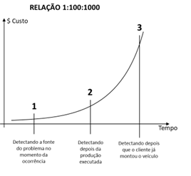 O primeiro passo é identificar qual é a causa raiz do problema: você pode usar a análise dos 5 porquês ou o Ishikawa. Em segundo lugar, realize um brainstorm com a equipe para que possam avaliar como identificar essas causas antes que elas gerem o problema de qualidade. Vale lembrar que há muitos sensores eletrônicos que estão disponíveis no mercado que podem ser utilizados para criar poka yokes. Seja criativo e pesquise constantemente os avanços tecnológicos com inteligência artificial e outras tecnologias que existem hoje! O terceiro passo é quantificar o ganho e a viabilidade da implementação. Nesse momento, você deve pedir ajuda para seu departamento financeiro e para a área da qualidade, para que, juntos, vocês possam identificar monetariamente quanto a empresa ganha com a implementação desse dispositivo. No gráfico abaixo, você pode ter uma referência do custo de um problema de qualidade para uma empresa do setor automotivo. Quanto mais próximo do cliente o defeito for identificado, maior será o custo.